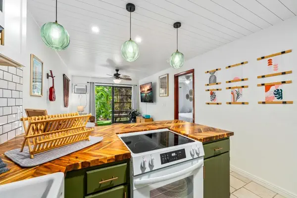 The newly remodeled, gorgeous two- bedroom two- bathroom 882 sq ft corner lower unit was the developer's model. Private unit with windows along the side of the unit providing great airflow. Enjoy romantic dinners from your own private garden corner lanai with lovely landscaping - featuring palms and colorful ornamentals. From this great location, you can enjoy the Kona beach lifestyle with this private end unit as your home base. For convenience, parking stall #104 is just steps away from the condo. Across the street is an ocean public access walkway and Honl's sandy beach with surf spots close by.