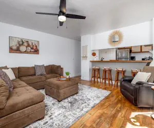 A beautiful element of this unit are the extra windows that showcase natural light throughout giving the feel of larger space. The living room has a cozy sectional sofa for 2 little ones or 1 adult comfortably. However, you also have the option of enjoying a queen-sized Inflatable mattress too!