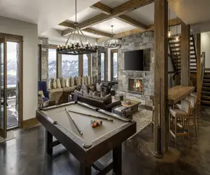 Advancing down the stairs to the lower level of the home, a fireplace sets a cozy scene behind the mountain vistas in this sophisticated recreation space. This recreation area is fully equipped with fun for all featuring foosball and pool tables, a powder room, a wet bar with seating, plenty of books and games, and ample lounge seating for the most comfortable possible quality time together.