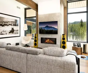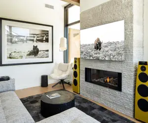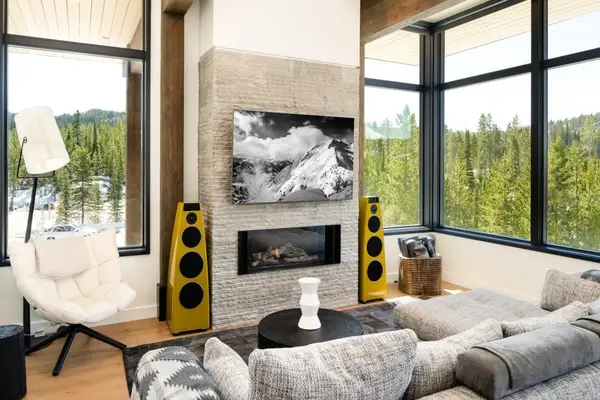The open living room has a large flat screen TV sitting above the gas fireplace, a movie theater quality surround sound system with large windows and glass doors that open out to spectacular views of Lone Peak.