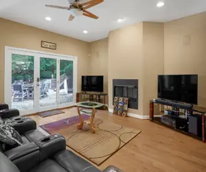 Step inside to find a beautifully decorated and spacious home, featuring an open floor plan with plenty of natural light. The living area is cozy and inviting, with comfortable seating and a large flat-screen TV, perfect for movie nights or catching up on your favorite shows.