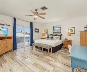 On arrival, there is ample off-street parking and two covered parking spaces beneath the home. Entry to Lazy Lobster's upper level is via stairs and into the open-plan kitchen, dining, and living areas. There is beautiful wood tile flooring throughout. The kitchen has plenty of granite countertops with subway tile backsplash behind the range and oven, and cabinets stocked with all the necessary items to prepare full-course meals or just snacks and coffee. Appliances are all stainless steel and include a 5-burner glass top range with a convection oven, a countertop microwave oven, a dishwasher, and a side-by-side refrigerator/freezer with water and ice dispenser in the freezer door. The granite-top island has cabinets and drawers on the kitchen side and two upholstered high-boy bar seats on the dining area side. The adjacent dining area has a table seating six. This flows into the living area which has a leather sleeper sofa with matching loveseat, accent tables and lamps, and two overstuffed chairs with a cocktail table in between. Opposite the seating area is a credenza with a wall-mounted large flat-screen TV. Off both the living and dining areas are sliding glass doors providing access out to a covered and screened-in deck that is well-furnished, boasting a table seating six, ceiling fans, and other cozy seating areas, making it the perfect place to enjoy the ever-changing sunsets and your favorite beverage. The master bedroom with en suite bath has a king-size bed, nightstands and lamps, an end-of-bed bench, a 5-drawer chest, a desk with chair and mirror, and another chest with a flat-screen TV. There is a large walk-in closet, and there are sliding glass doors leading out to an open deck furnished with two chairs and a cocktail table. This deck has a gas grill and overlooks the tropically landscaped backyard below. The bathroom has a single-piece vanity with a lavatory and storage space beneath, a commode, and a nicely tiled walk-in shower with a glass door and glass wall. The guest bedroom has two queen-size beds, a nightstand and lamp, and a 5-drawer chest with a flat-screen TV. Ample closet space and sliding glass doors out to the previously described deck overlooking the backyard. The adjacent guest hall bathroom has a single-piece vanity with a lavatory and storage space beneath, a commode, and a nicely tiled combination tub/shower.