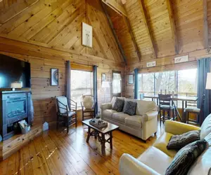 Step into the warm and inviting living room and get cozy in the perfect blend of comfort and style. The plush sofa sleeper and loveseat provide a comfortable spot to relax and unwind, while two chairs offer additional seating for lounging around the electric fireplace, which casts a warm glow over the room as you sit back and enjoy your favorite TV show or movie on the flat-screen TV. As you settle in, you'll feel like you're in your own private retreat, surrounded by the rustic charm of the cabin's natural wood accents. This room is perfect for relaxing and recharging after a day of exploring the Great Smoky Mountains National Park or simply enjoying quality time with loved ones.
