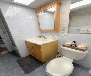 The full bathroom includes standing shower, toilet, and single vanity area. Plus, extra vanity space or workspace right outside bathroom.