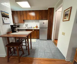 This home includes full kitchen with brand new appliances, including range, dishwasher, fridge/freezer, and microwave. Also includes coffee maker, mugs, cups, dishes, cutlery, basic cookware and more. Quaint breakfast bar with 2 seats available for dining in kitchen.