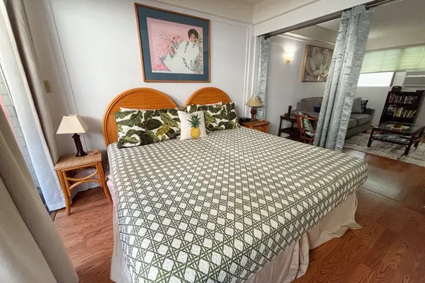 Only 2 block walk to world famous Waikiki Beach, this 1-bedroom apartment at the Hawaiian King building is the perfect twist, where retro Hawaii meets modern comforts. Located in the heart of Waikiki, right off popular Kuhio Ave, enjoy easy access to world-renowned shopping, dining, and entertainment! Our unit features one bedroom, separated from living room by curtain room divider, great closet space, full kitchen, breakfast bar, private lanai with outdoor seating, desk/chair, A/C, tv, wifi, and cable. Not to mention, down below in the Hawaiian King courtyard, escape the hustle & bustle and take a dip or sun bathe by the beautiful pool!