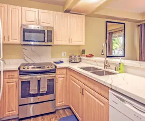The kitchen is a blend of style and practicality, featuring ample storage space and marble countertops. Equipped with a coffee maker, toaster, oven, and range, it's the perfect space for whipping up delicious meals during your stay.