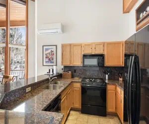 Residence #45 boasts floor-to-ceiling windows that flood the living area with natural light while showcasing the stunning vistas of Snowmass. The inviting living room is perfect for relaxation after a day on the slopes, equipped with cable/satellite TV and high-speed internet access for your entertainment needs.