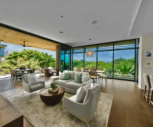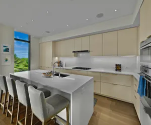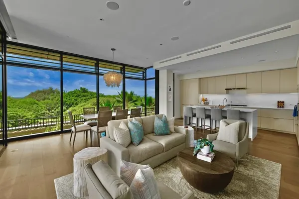 You will love this indoor-outdoor living concept that creates a natural extension between the interior of the home and outdoor space. Complete with private hot tub, lounge seating, dining area, and ceiling fan the lanai also features a built-in Wolf BBQ. An open-floor plan invites you inside and offers a seamless transition between spaces. Although Oahu’s cooling trade winds flow effortlessly throughout the home, central air conditioning are also provided for your extra comfort. Floor to ceiling windows display lovely views from the main living spaces and provide an abundance of natural light that highlights a sophisticated, minimalist color palette. Relax in style in the comfortable living area designed with cozy furnishings and television, or indulge with an island-style meal at home from your spacious dining area. The fully-equipped gourmet kitchen has everything you need for chef-style cooking at home. Including Studio Becker cabinets, Subzero refrigerator, and Wolf appliances - gas range stove, double ovens, and dishwasher.