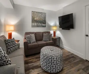 La Pasta is named after the second restaurant to occupy the barn. It is a modern 2000 sq foot 4/3 lower level unit that does have some outdoor large, flat stairs to navigate and can accommodate 10 people. While it is a lower level unit you can hear footsteps from the unit above. It is a very open unit with plenty of windows in the bedrooms and higher windows in the living area. It is a fun unit that is more contemporary and has just a touch of the barn look to it. The TV in the den gives the kids a place to escape and adds some privacy. The den also houses a sleeper couch for extra space if needed. Being a lower unit, La Pasta stays cool all summer long without the use of A/C. In the winter, the bus stops at the property and in the summer there are hiking trails right off of the property. When you are done with all of your activities, take a soak in your private hot tub.
