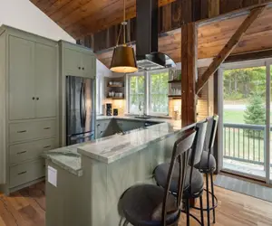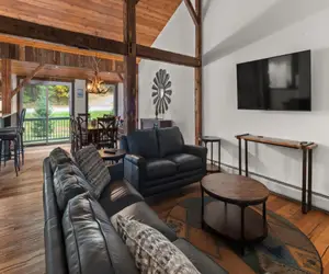 This 3 bedroom 3 bath unit Orsini's, boasts an impressive 2,000 square feet of living space, making it the ideal choice for families or groups of friends. What sets Orsini's apart is its single-level design, eliminating the need to navigate stairs and ensuring accessibility for all. This spacious unit comfortably accommodates up to eight guests and marries Vermont barn aesthetics with contemporary amenities. The open floorplan creates a seamless flow between the full modern kitchen, wet bar, dining area, and living space. A 55" smart TV graces the living area, perfect for movie nights or catching up on your favorite shows. Additionally, there's a separate den furnished with a sleeper sofa and another 55" smart TV, offering a cozy nook for relaxation. The living space includes realistic electric fireplace, complete with steam effects, adds a touch of cozy warmth to your evenings. Bedrooms have A/C for warm summer months.