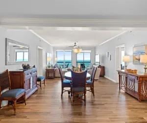 The dining area is delightful, completely open to the living area and has seating for 6 under the clear sea glass chandelier.