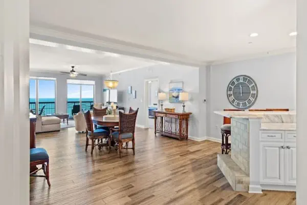 The living room is relaxed yet refined and has access to the balcony and an incredible north-facing view of the Atlantic Ocean and beach below!