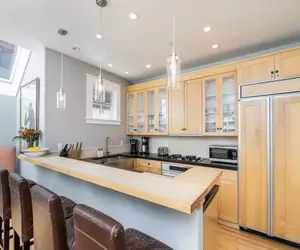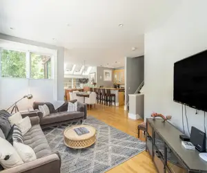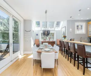 Enter into a small mudroom area perfect for hanging your coat and dropping your bag and head up the stairs to the sunny, spacious living room. The open-concept space features wall-to-wall windows with mountain top and city views. Relax in the living room with plenty of seating for your party or enjoy a meal at the dining table for eight. The breakfast bar offers additional seating and a cozy spot to chat about the day's adventures over a snack. Sliding glass doors open to a small deck with a full-sized grill and two Adirondack chairs. The kitchen provides a coffee maker, toaster, oven, stove, dishwasher and large refrigerator for all of you home away from home convenience.
