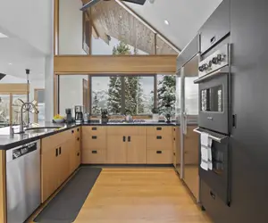 The 3,050 square foot home offers guests spacious and stylish common areas with an open concept living room, dining room and kitchen. The living areas boast 270 degree views of the Sundance ski run and the surrounding mountain ranges, with soaring 18 foot floor-to-ceiling windows. Enjoy the electric fireplace (heat and light) and the large flat-screen TV. Above the main living area there is a bonus loft area for kids' TV viewing or office zoom calls.