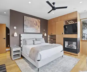 The bedrooms and powder room are located below the main living area. There are two king bedrooms, both with gas fireplaces, en suite bathrooms, and private balconies. The king master bedroom features a Tempur-Pedic mattress, an en suite bathroom with a steam shower and separate tub, and majestic mountain views through wall-to-wall windows. The second king bedroom also enjoys mountain views. The third and fourth smaller bedrooms adjoin with a sliding door for maintaining privacy between them. The third bedroom features two twin XL beds which can be combined to become a king if desired. The adjoining fourth bedroom has a full-over-full bunk bed. The third and fourth bedrooms share an en suite bathroom. Also on this level is the home's dedicated laundry room with a large washer and dryer.