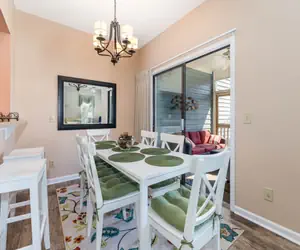 The adjacent dining area offers seating for six at the table plus two at the bar, and provides direct access to the screened‑in porch—ideal for indoor‑outdoor living.