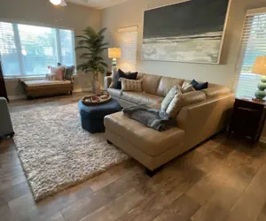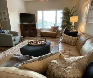 The vibrant living area features a comfortable leather sectional sofa ️ and a driftwood‑style writing desk, offering both comfort and functionality. Just beyond, the beautifully appointed kitchen is outfitted with dark wood cabinetry, granite countertops, and stainless steel appliances, along with all the cookware and utensils you need to prepare memorable meals .