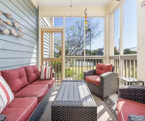 Step out onto the screened‑in porch, furnished with a sofa and two chairs, and enjoy peaceful views of the 78Fitness tennis courts —a relaxing spot for morning coffee or evening wind‑down time.