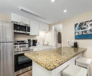 Enter from the front furnished deck into the dining area with a table and seating for four. Step up into the open-plan kitchen and living area. There is a combination of wood and tile flooring throughout. The kitchen has hard-surface countertops, a stainless steel sink, and cabinets with all the necessary items to prepare meals or just coffee and toast in the morning. Just adjacent to the kitchen is a stacked washer/dryer set and a door leading out to the rear deck. Stainless-steel appliances include a 4-burner glass top range with oven, above range microwave oven, Keurig coffee maker and refrigerator/freezer with ice-maker. There is a peninsular granite-top bar between the kitchen and living area with two bar stools on the living area side. The living area has a queen-size sleeper sofa with end tables and lamp, a coffee table and one side chair. There is also a credenza with a large wall-mounted flat-screen TV above.