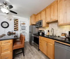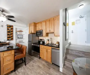 This conveniently located first-floor unit is beautifully furnished, decorated, and efficiently laid out room floor plan (see room floor plan tab below). It has a King size Bed and a sofa sleeper, a double vanity bathroom sink, a kitchen with a full-size refrigerator, a 4-top stove with oven, a dishwasher, a Keurig coffee maker, an eat-in bar with seating for three, and a 4-top kitchen table and chairs. There is a cozy seating area with an electric fireplace and a 50" Flat-screen TV. In addition, the updated bathroom and double sink vanity area help create a spa-like feel. This unit is close to the parking lot, the interior sitting area, and the common area barbecues.