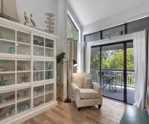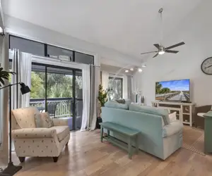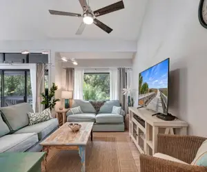 Enjoy the pristine golf & lagoon views from the back deck. The deck happens to overlook the 10th fairway on the Fazio course. This villa is so open and airy! It features two bedrooms and two bathrooms. The master bedroom offers a king sized bed and smart TV with the upstairs guest room having a queen-sized bed and twin trundle bed. There is also a queen sleeper sofa in the living room. The spacious living area includes an HD TV and a full size kitchen/dining area that opens to the deck. Take an easy walk or bike ride to the beach, tennis, golf courses and any of the many amenities offered at the beautiful Palmetto Dunes Resort. The loft also includes an entertainment area with free wifi access.