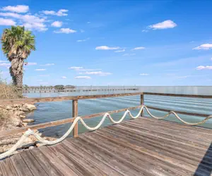 Brand new 1 bedroom top of the line home located right on Copano Bay. Upgraded appliances including gas range, wine cooler, ice machine and more. Upscale bedding, and furnishings. The most amazing view of any home in Rockport! Private screened in porch with a sectional sofa and plenty room to get comfortable and watch the most amazing sunsets in South Texas. There is also a private pier for fishing and just sitting and having great conversation. Streaming TV only.