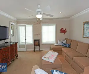 The ground floor bedroom has bright, colorful beachy décor, a queen bed and wall-mounted flat panel TV. The adjacent hall bath has a tub/shower combination. Upstairs, the tastefully decorated master bedroom has a queen bed, ceiling fan, wall-mounted flat panel TV, walk-in closet and en-suite bath with shower. Kids will love the nautically-themed second bedroom with twin over double bunk and a full-size trundle. The nearby hall bath has a tub/shower combination.