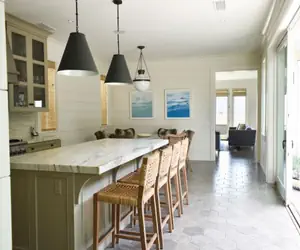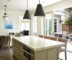The kitchen is fully equipped and includes gourmet appliances like a Subzero fridge and Viking range, as well as gorgeous white marble countertops. The dining table seats six and the marble center island is roomy and can seat four on bar stools for extra seating.