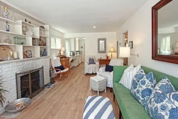 The inviting Dutch door makes it easy to enjoy the ocean air. The comfortable living room has a contemporary sofa, two side chairs, an ottoman, and flat panel cable TV. A lovely four-person dining table sits between two large picture windows. The well-appointed kitchen has marble counters, a farmhouse sink, full pantry, dishwasher, and microwave. The fireplace is decorative and non operable.