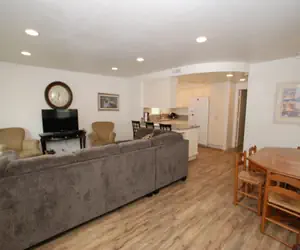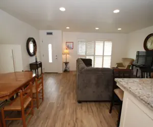 The spacious living room has plenty of seating and a large flat screen TV, the living area is roomy enough for the whole family to relax. The dining area has a large table with six chairs along with extra seating at the bar in the kitchen. The spacious kitchen has beautiful granite countertops, a full range, microwave, full-sized fridge and dishwasher.