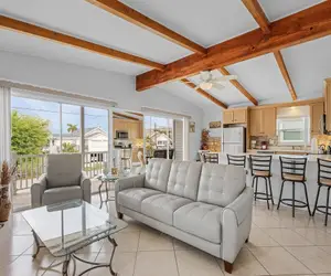 Upon arrival entry to the upper level is via steps up to the front door and into the open plan living room and eat-in kitchen. This home has vaulted ceilings and beautiful tile flooring in the main area and wood flooring in the bedrooms. Decor is beachy/nautical. The large kitchen has plenty of hard surface countertops with tile back splash, and cabinets with all the necessary items to whip up full course meals if so desired. Just bring the food! There is a stainless-steel sink with disposal. Appliances are all stainless-steel and include a dishwasher, a 5-burner glasstop range and oven, built-in above-range microwave oven and refrigerator/freezer with ice-maker. Other kitchen amenities include a coffee maker, an adjacent desk with chair, and a peninsular bar with drawers and cabinets on the kitchen side and six bar seats on the living area side. The adjacent living area has a leather sofa, a side chair and accent tables, opposite which is a wall-mounted large flat screen TV. There are sliding glass doors from both the kitchen and living areas out to an open yet covered front deck furnished with a swing and deck chairs overlooking the front of the home.