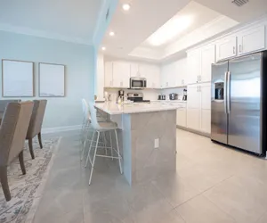 This condo showcases stunning floor-to-ceiling windows that fill the space with natural light and offer breathtaking views. Professionally decorated, the living area is both inviting and stylish, featuring a flat-screen TV for your entertainment. The dining room table comfortably seats six, with four additional barstools at the breakfast bar for extra seating.