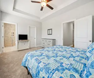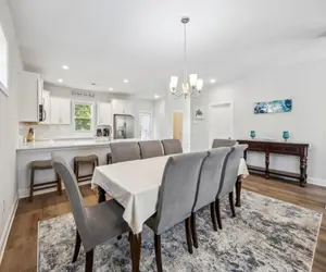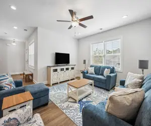 The open floor plan seamlessly connects the kitchen, dining, and den areas, making it an ideal space for gathering with family and friends. The den features a large TV for cozy movie nights, while the dining table comfortably seats 8, with an additional 4 bar stools at the kitchen counter. The kitchen is fully equipped with brand-new appliances, including a stove, oven, dishwasher, side-by-side refrigerator, coffee maker, and Keurig machine. Upstairs, the primary bedroom is a serene retreat with a king bed, TV, spacious closet, and a private bathroom featuring a stand-up shower and double sink. Three additional guest bedrooms ensure plenty of space for everyone. One of these bedrooms boasts a queen bed and a private bathroom with a stand-up shower, while the others share a hallway guest bathroom with a tub/shower combination. Each bedroom is equipped with a TV for added comfort.