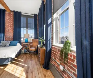 Take a break from the grind in this urban queen-sized apartment with a perspective all its own. You’ll feel like you’re getting an aerial view of the world with huge windows contrasted with deep rich blue hues. With a style that’s both sleek and cozy, this room will inspire you to do your best work—or to take the breather you’ve been waiting for. Amenities like the equipped kitchenette, full bathroom, and comfortable bedding keep you feeling right at home while you get away.