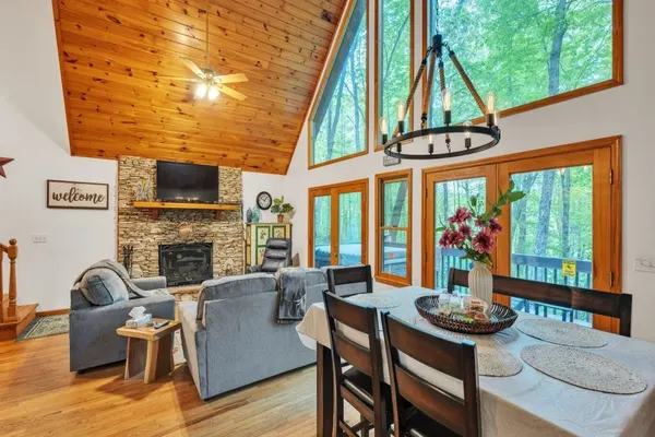 Pet Friendly w/ Fee - Direct Lake Access via a hiking trail or community stairs - 2 Canoes - 400+ Gaming cocktail table - 400+ movie library - Ring Toss - Corn Toss - Gas Grill - Large screened porch - Large open patio with private Hot Tub - Fire Pit - Boating, Fishing, Waterskiing, Paddleboarding and more can be enjoyed on beautiful Lake Apalachia. Families and friend groups with an adventurous spirit will love enjoying uninterrupted serenity and year-round outdoor attractions at the ‘Apalachia Lake House!’Bedroom 1: Queen Bed | Bedroom 2: Queen Bed | Game Room (Loft): Trundle Day Bed (2 Twins)INDOOR LIVING:Cathedral ceilings w/ floor-to-ceiling windows, lake and forest views, 3 flat-screen TVs, StarLink WiFi, great for zoom calls and streaming, 3 Blu-ray DVD players, video library (400+ movies), wood-burning fireplace, game room w/ cocktail arcade system (400+ games), books & board games, corn toss and the famous ring game.OUTDOOR LIVING:Private canoe launch w/ area to moor personal boat (must bring your own mooring equipment), paddles & various life-jacket sizes, screened-in porch w/ hammock chairs, outside dining table and seating areas, swing bench, ceiling fans in living/dining areas, an additional private screened-in balcony (off upstairs bedroom 2) w/ seating & ceiling fan, deck w/ dining table, gas grill (gas provided), fire pit, corn hole, 5-seater hot tub w/ lounger, access to a boat ramp ~25 minutes awayKITCHEN:Fully equipped w/ blender, cooking basics, dishware/flatware, Keurig coffee maker w/ K-Cups provided, drip coffee maker, hot water pot, microwave, spices, toaster oven, newer appliances, basically anything you should need pretty much