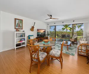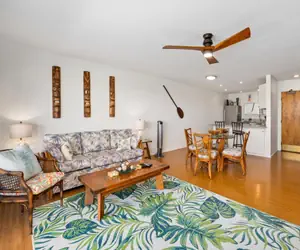 The fully equipped kitchen has all the appliances you need, including a full-sized stove, refrigerator, and dishwasher. The dining table seats four and is just off the kitchen. Enjoy meals on the lanai, which features a private BBQ and ample seating for relaxation.