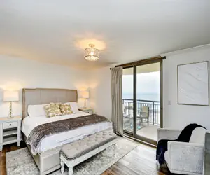 Primary Bedroom: King bed with balcony access and a remodeled en‑suite bathroom featuring a double vanity and large walk‑in shower
