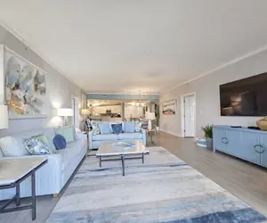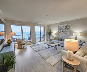 The living room features 2 sofas, with one having a pullout bed, a large smart TV and access to the oceanfront balcony.