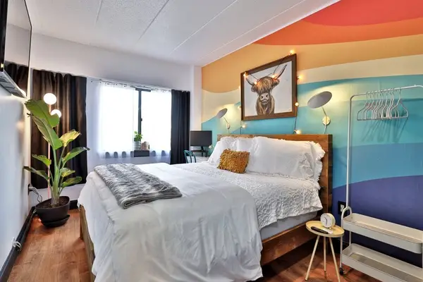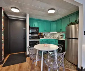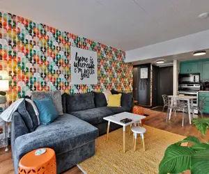 The living room has everything you need to relax and have fun: Netflix, Hulu, Disney+, and ESPN; a Joybird sectional for lounging (with a premium, full-sized pull-out for sleeping); games and books for all ages; a bar cart; and a reading nook for some quiet time or for toddlers at bedtime. The kitchen is fully equipped with a coffee bar, kid-friendly tableware, and everything you need to cook or bake - including curated, ready-to-make meals. The bedroom has a top-of-the-line king bed, a WFH station with a monitor, blackout curtains, and plenty of room to hang all your gear.