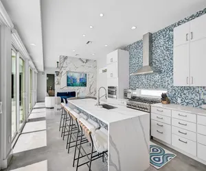The deluxe kitchen is a chef's dream, fully stocked with all the essentials needed to prepare gourmet meals. The stunning white granite countertops and the large island with a sink and three barstools make it a perfect space for both cooking and socializing. State-of-the-art stainless appliances ensure that you have everything you need at your fingertips. Adjacent to the kitchen is a modern dining table that comfortably seats four, creating an intimate setting for family meals or entertaining guests.