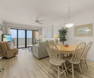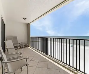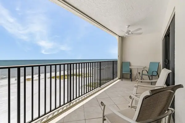 Enter through the front door into a foyer/hallway. There is beautiful wood flooring throughout, with the exception of tile in the laundry and bathrooms. Step into the open-plan kitchen, dining and living areas. The kitchen comes fully equipped, including a Keurig coffee maker, glasstop range and self-cleaning oven, built-in above-range microwave oven, side by side refrigerator/freezer with in-door ice and water dispensers, dishwasher and double stainless steel sink with disposal. There are plenty of cabinets and hard surface countertops with backsplash. Everything is available that you would need to cook daily multicourse dinners, or simply make a pot of coffee in the morning. Just bring the food! A peninsular bar separates the kitchen from the dining area. The dining table seats six. The living room is nicely furnished with a sofa and love seat, end tables with lamps, coffee table, leather recliner and flat screen TV. This property provides a foldable crib for those traveling with small children. Sliding glass doors lead to the furnished full length balcony overlooking the few short steps to the beach. At six floors up it affords awesome views of the beach, the gulf and palms swaying in the breeze.