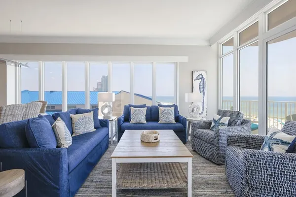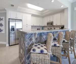 The dining area provides seating for eight at the table, with four additional barstools at the breakfast bar. This beautifully decorated corner unit offers a large balcony with ample seating, perfect for enjoying the breathtaking views of the Gulf of America with the whole family.