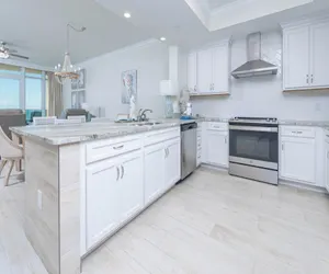 Phoenix Gulf Towers 407 is a three-bedroom, three-bath, Gulf-front condo in Orange Beach, Alabama. It sleeps up to ten guests with a king in the master bedroom, two queens in the second bedroom, and two queen beds in the third bedroom. Each bedroom has its own ensuite bathroom.
