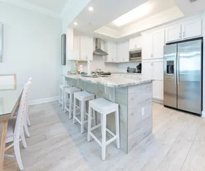The condo is beautifully decorated with leather recliners in the living room and flat-screen TVs throughout. The dining room table seats six, and there are four additional barstools at the breakfast bar. The kitchen features stainless steel appliances. There's also a bar with a separate sink and ice maker.