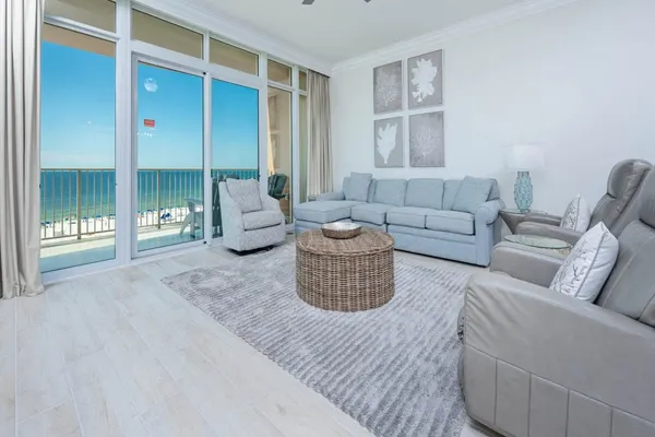 The master bathroom includes double vanities, a walk-in shower, and a soaking tub. The large balcony provides stunning views of the Gulf of America, making it a perfect spot to relax and enjoy the scenery.