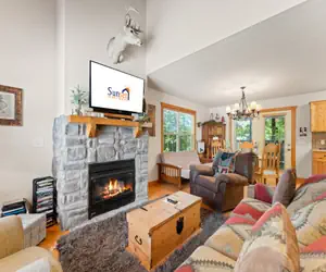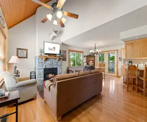 The one-bedroom, one-and-a-half bathroom cabin is a cozy, comfortable retreat. It features a fully outfitted kitchen, complete with a stove, refrigerator, microwave, and all the necessary utensils and dishes. The living area is furnished with comfortable seating and a large flat screen television with access to cable programming. The bedroom has a king-sized Serta Perfect Sleeper bed, as well as a comfortable sofa bed in the living room, providing sleeping space for up to four people.