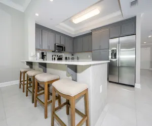 This inviting condo showcases floor-to-ceiling windows that fill the space with natural light. The dining room features seating for eight, complemented by additional barstools at the breakfast bar, perfect for casual dining. The modern kitchen is equipped with sleek gray cabinets and stainless steel appliances, making meal preparation a breeze.