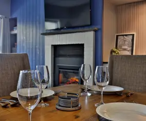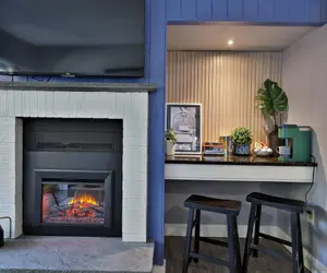 The open living area boasts an electric fireplace, providing a warm ambiance to unwind after a day of outdoor adventures, while the Smart TV offers a cozy spot to catch up on your favorite shows or stream your favorite content.