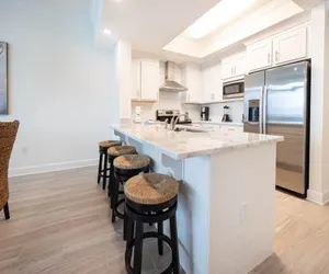 This condo is stunningly furnished with thoughtful decor throughout. The dining area provides seating for six at the table, with four additional barstools at the breakfast bar, making it perfect for family meals. The kitchen is fully equipped with stainless steel appliances and features sleek countertops, ideal for cooking and entertaining. Flat-screen TVs are available throughout the condo for your entertainment.